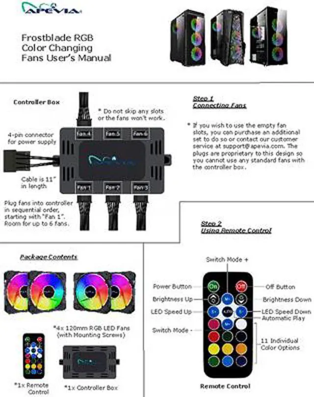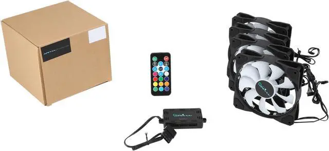 | Package Contents | 4 x RGB Fans, 1 x RF Remote Control, 1 x Controller Box, 16 Mounting Screws, User's Manual |
