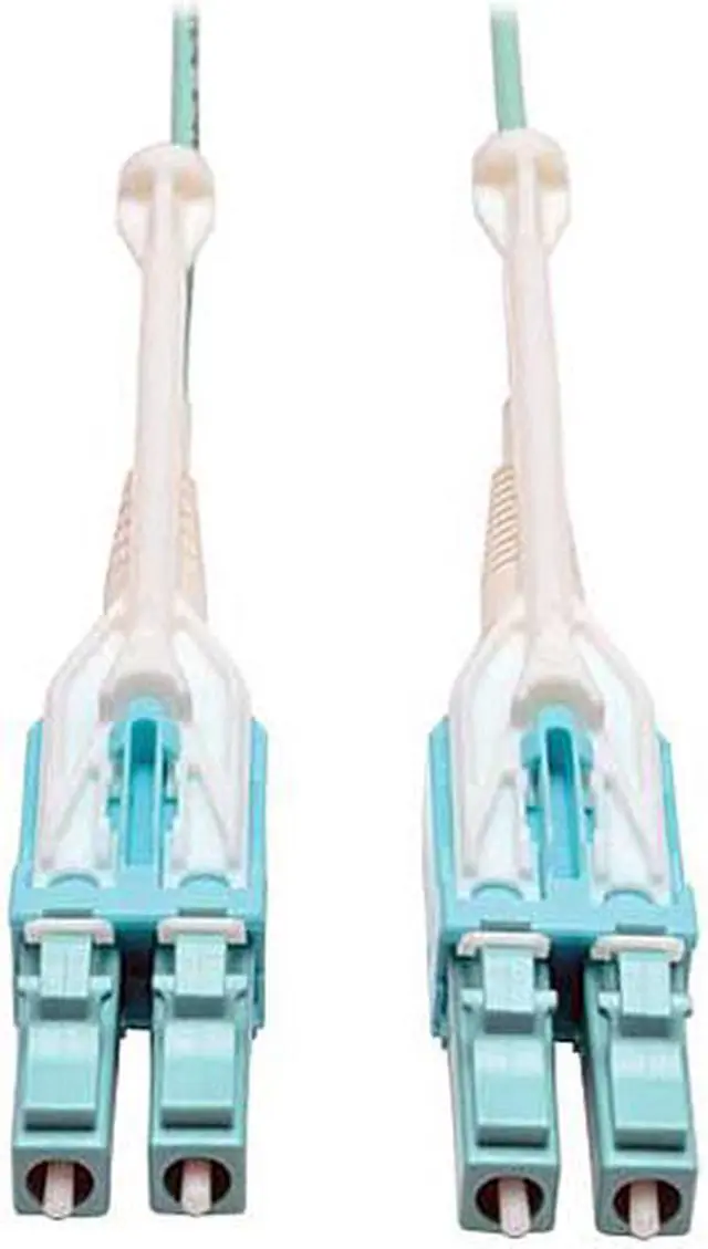 Tripp Lite's N820-02M-T is an OM3 Laser-Optimized Multimode Fiber (LOMMF) "Aqua" cable, for use with 10Gb Ethernet applications. This 50/125um, LC/LC Fiber Optic cable provides nearly three times the bandwidth over conventional 62.5um multimode fiber, with performance rivaling that of Singlemode cable, at a much reduced cost. Each LC/LC connector features a push/pull tab, providing maximum accessibility in high density installations. LOMMF cable allows 10Gb serial transmission over extended distances in the 850nm wavelength window, where low-cost Vertical Cavity Surface Emitting Lasers (VCSELs) enable a cost-effective, high-bandwidth solution. LOMMF is ideally suited for LAN's, SAN's, and high-speed parallel interconnects for head-ends, central offices, and data centers.