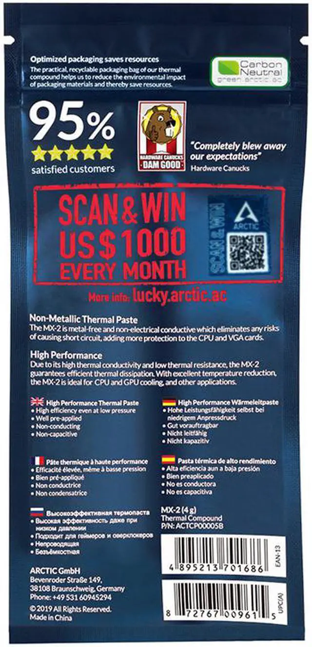 The ARCTIC MX-2 compound is composed of carbon micro-particles which lead to an extremely high thermal conductivity. It guarantees that heat generated from the CPU or GPU is dissipated quickly and efficiently. Superb in performance, MX-2is the best companion for overclockers and enthusiasts.