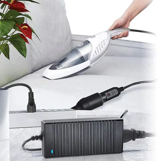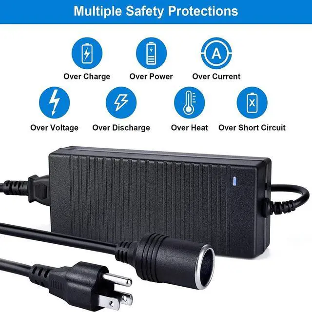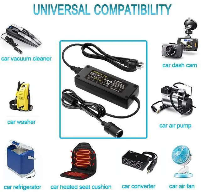 100-240V AC household current to 12V 10A DC and allows you to maximize your car accessories with this AC to DC converter. All you need to do is plug your 12V product into the adapter socket, then plug the adapter into any household wall outlet.