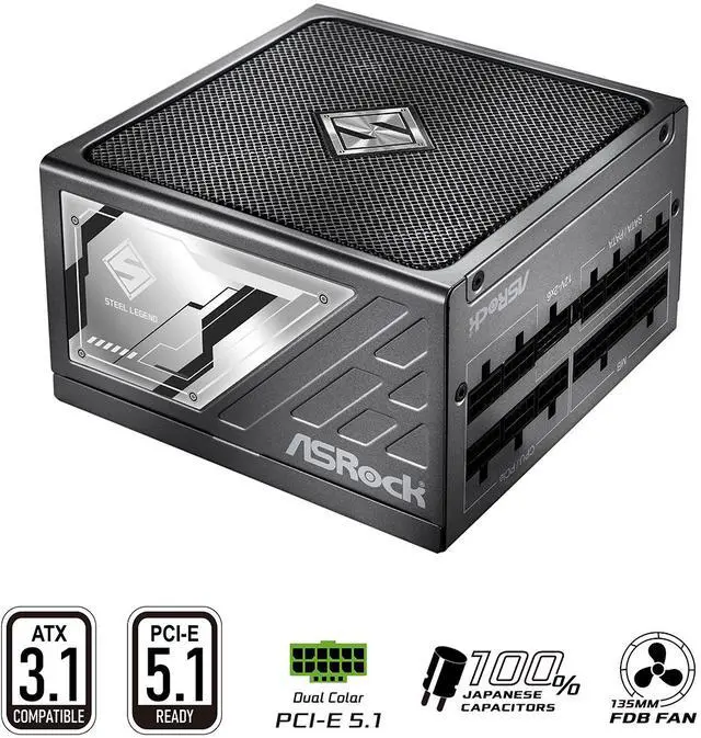 ASRock Steel Legend SL-1000P 1000W 80 PLUS GOLD & Cybenetics PLATINUM Full Modular Power Supply, ATX3.1 & PCIe5.1 Ready with Dual Color 12V-2x6 Cable, 10 Years Warranty