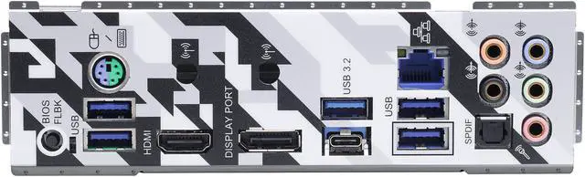 | Back I/O Ports | 2 x Antenna Mounting Points 1 x PS/2 Mouse/Keyboard Port 1 x HDMI Port 1 x DisplayPort 1.4 1 x Optical SPDIF Out Port 1 x USB 3.2 Gen2 Type-A Port (10 Gb/s) (ReDriver) (Supports ESD Protection) 1 x USB 3.2 Gen2 Type-C Port (10 Gb/s) (ReDriver) (Supports ESD Protection) 4 x USB 3.2 Gen1 Ports (Supports ESD Protection)* 1 x RJ-45 LAN Port with LED (ACT/LINK LED and SPEED LED) 1 x BIOS Flashback Button HD Audio Jacks: Rear Speaker / Central / Bass / Line in / Front Speaker / Microphone (Gold Audio Jacks) * Ultra USB Power is supported on USB3_1_2 ports. * ACPI wake-up function is not supported on USB3_1_2 ports. |