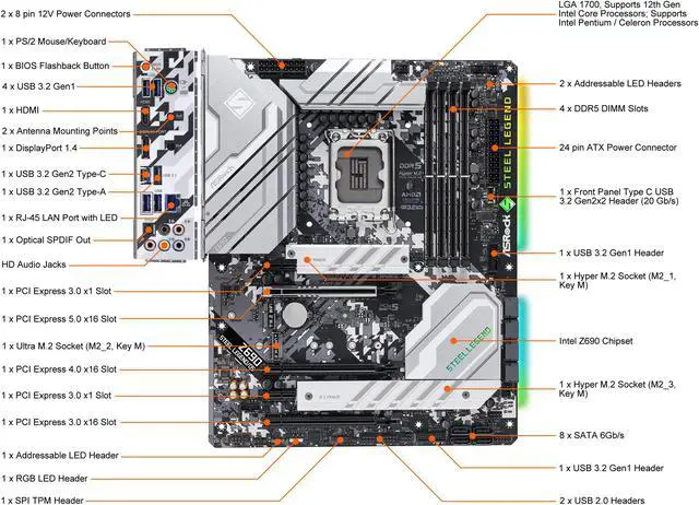 | Features | Unique Feature: ASRock USB 3.2 Gen2 - ASRock Front Panel Type C USB 3.2 Gen2x2 Header (20 Gb/s) - ASRock USB 3.2 Gen2 Type-A Port (10 Gb/s) - ASRock USB 3.2 Gen2 Type-C Port (10 Gb/s) ASRock Super Alloy - XXL Aluminum Alloy Heatsink - Premium Power Choke - 50A Dr.MOS - Nichicon 12K Black Caps (100% Japan made high quality conductive polymer capacitors) - I/O Armor - Matte Black PCB - High Density Glass Fabric PCB - 2oz Copper PCB 2.5G LAN ASRock Auto Driver Installer ASRock Steel Slot ASRock Full Coverage M.2 Heatsink ASRock Hyper M.2 (PCIe Gen4x4) ASRock Ultra USB Power ASRock POST Status Checker (PSC) ASRock Full Spike Protection (for all USB, Audio, LAN Ports) ASRock Live Update & APP Shop BIOS: - 256Mb AMI UEFI Legal BIOS with multilingual GUI support - ACPI 6.0 Compliant wake up events - SMBIOS 2.7 Support - CPU Core/Cache, CPU GT, DRAM, VCCIN AUX, +1.05V PROC, +1.8V PROC, +0.82V PCH, +1.05V PCH Voltage Multi-adjustment Software and UEFI: Software - ASRock Motherboard Utility (A-Tuning) - ASRock Dragon 2.5G LAN Software - ASRock Polychrome SYNC* UEFI - ASRock EZ Mode - ASRock Full HD UEFI - ASRock My Favorites in UEFI - ASRock Auto Driver Installer - ASRock Instant Flash - ASRock Internet Flash - ASRock Easy RAID Installer * These utilities can be downloaded from ASRock Live Update & APP Shop. Support CD: - Drivers, Utilities, AntiVirus Software (Trial Version) Hardware Monitor: - Fan Tachometer: CPU, CPU/Water Pump, Chassis/Water Pump Fans - Quiet Fan (Auto adjust chassis fan speed by CPU temperature): CPU, CPU/Water Pump, Chassis/Water Pump Fans - Fan Multi-Speed Control: CPU, CPU/Water Pump, Chassis/Water Pump Fans - Voltage monitoring: CPU Vcore, PCH, VDD2, VCCIN AUX, +1.05V PROC, VCCSA, +1.8V PROC, +0.82V PCH, +12V, +5V, +3.3V OS: - Microsoft Windows 10 64-bit / 11 64-bit Certifications: - FCC, CE - ErP/EuP ready (ErP/EuP ready power supply is required) - CEC Tier II ready |