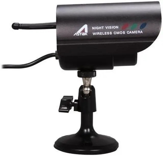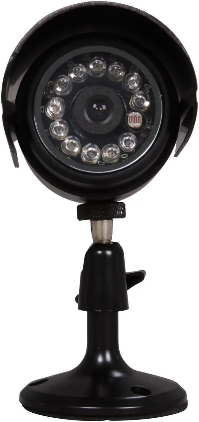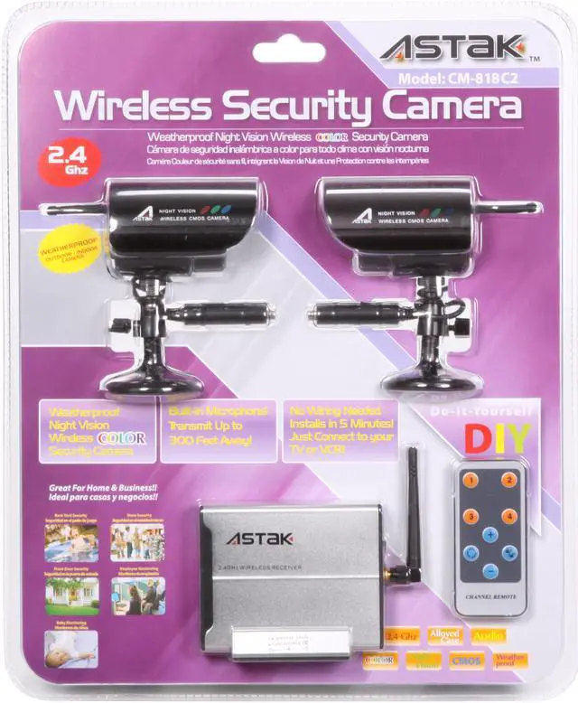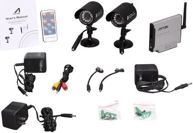 | Features | CMOS wireless security camera set (2 cameras) Weatherproof (Indoor/Outdoor) Night Vision ( with 12 IR LEDs, night vision range : 20 feet) Clear color image (380 TV line resolution) Wireless receiver supports up to 4 cameras Remote control included Built-in microphone and channel switch Transmission range : up to 300 feet No wiring needed, easy installation Just connect to your TV or VCR Wireless receiver supports up to 4 cameras |