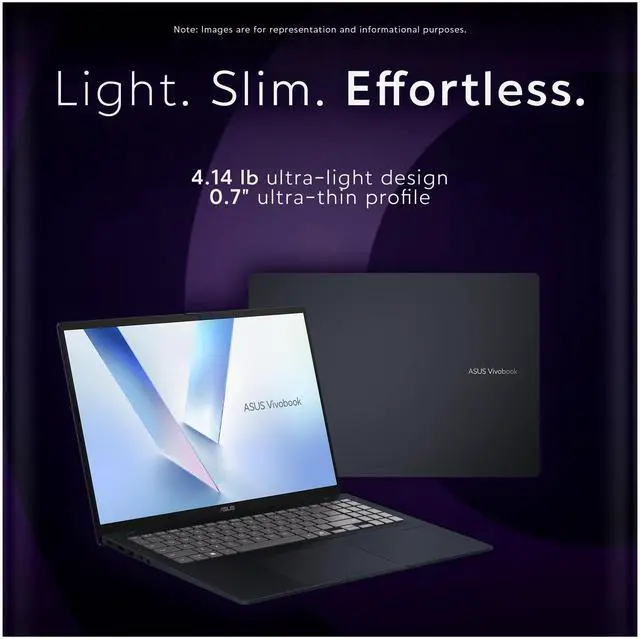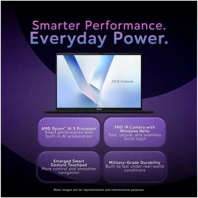 The ASUS Vivobook 16 delivers exceptional performance for everyday users, combining a sleek design with the latest AI-driven technology. This 16-inch laptop is crafted for high-efficiency workflows, offering a lightweight build of 4.17 pounds that ensures portability for daily tasks. Powered by the AMD Ryzen AI 300 Series processor, specifically the AI 5 330 model, the device provides reliable speed for multitasking with a boost frequency of 4.5 gigahertz. The expansive 16-inch WUXGA IPS display features an anti-glare surface, providing a comfortable viewing experience with 300 nits of brightness while ensuring clear visuals for both productivity and entertainment. Visual communication is managed by a high-definition 1080p front-facing camera, which supports facial recognition for secure and rapid biometric login. This camera system pairs with a built-in microphone to ensure your voice is captured clearly during video conferencing while maintaining privacy standards. For fast wireless connectivity, the laptop utilizes Wi-Fi 6 and Bluetooth standards, maintaining stable and high-speed connections for all your modern peripherals. The inclusion of a precision touchpad and a full-size keyboard with a numeric keypad enhances utility and typing efficiency, making it a highly effective tool for focused office work or mobile student environments in any setting. Reliable energy is provided by a 4-cell lithium-ion battery, designed to power through busy workdays with up to 10 hours of battery life. The laptop supports USB-C power delivery via its 65-watt power supply, allowing for efficient energy management during long sessions. Its professional Quiet Blue aesthetic is built to be durable while meeting high standards for mobility and performance. By blending a modern quad-core AI processor with a large IPS display and a robust battery, the Vivobook 16 stands as a premier solution for users who prioritize efficiency and portable productivity.
