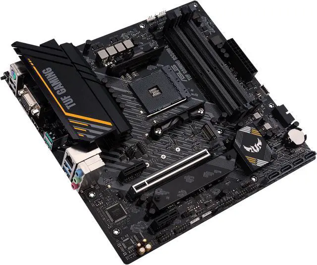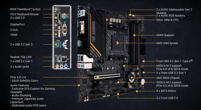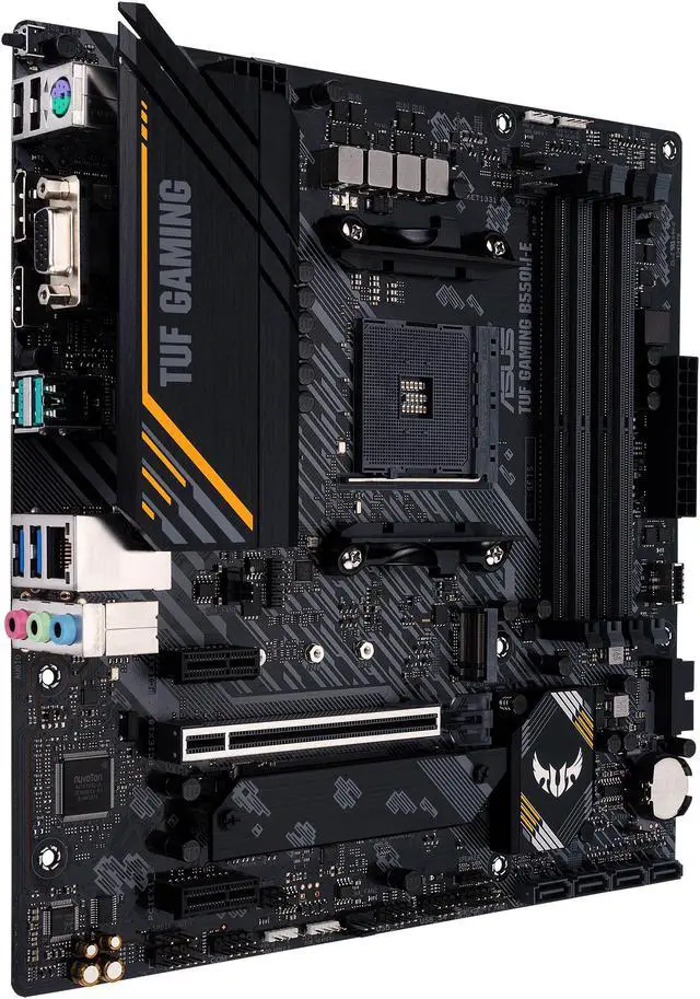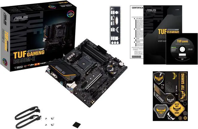 TUF Gaming B550M-E provides a complete, high-performance gaming package with a long list of features to improve your experience, including ultrafast networking for smoother online gameplay, pristine audio with positional cues for FPS gaming, and onboard RGB lighting that syncs with attached accessories to help you create a personalized gaming atmosphere.