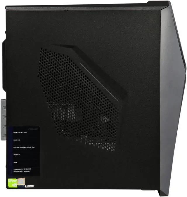 Asus ROG Strix GL10CS-DS751 Gaming Desktop Computer - Core i7 i7-8700 - 8 GB RAM - 1 TB HDD - Tower - Iron Gray - Windows 10 64-bit - NVIDIA GeForce GTX 1050 2 GB - Wireless LAN - BluetoothProcessor Manufacturer: IntelProcessor Type: Core i7Processor Generation: 8th GenProcessor Model: i7-8700Processor Speed: 3.20 GHzStandard Memory: 8 GBMemory Technology: DDR4 SDRAMTotal Hard Drive Capacity: 1 TBOptical Drive Type: NoGraphics Controller Manufacturer: NVIDIAGraphics Controller Model: GeForce GTX 1050Graphics Memory Capacity: Up to 2 GBGraphics Memory Technology: GDDR5Graphics Memory Accessibility: DedicatedWireless LAN: YesBluetooth: YesTotal Number of USB Ports: 6Number of USB 2.0 Ports (Rear): 2Number of USB 3.1 Ports (Front): 2Number of USB 3.1 Ports (Rear): 2Operating System Platform: WindowsOperating System: Windows 10Operating System Architecture: 64-bitColor: Iron GrayForm Factor: TowerHeight: 7.1Width: 16.9"Depth: 16.9"Weight (Approximate): 17.60 lbPackage Contents: Strix GL10CS-DS751 Gaming Desktop Computer 1 x Keyboard 1 x Mouse 1 x Power Cord 1 x Warranty Card 1 x Quick Manual Environmentally Friendly: YesEnvironmental Certification: RoHSLimited Warranty: 1 YearPackage Contents Strix GL10CS-DS751 Gaming Desktop Computer 1 x Keyboard 1 x Mouse 1 x Power Cord 1 x Warranty Card 1 x Quick Manual "