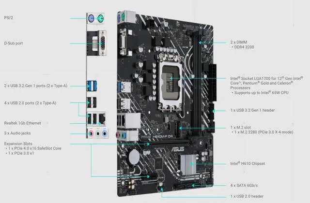 asus. com for memory support list. 2 x USB 3.2 Gen 1 ports (2 x Type-A) 4 x USB 2.0 ports (4 x Type-A) 1 x D-Sub port 1 x Realtek 1Gb Ethernet port 3 x Audio jacks 1 x PS/2 Keyboard (purple) port 1 x PS/2 Mouse (green) port Fan and Cooling related 1 x 4-pin CPU Fan header 1 x 4-pin Chassis Fan header Power related 1 x 24-pin Main Power connector 1 x 4-pin + 12V Power connector Storage related 1 x M. 2 slot (Key M) 4 x SATA 6Gb/s ports USB 1 x USB 3.2 Gen 1 header supports additional 2 USB 3.2 Gen 1 ports 1 x USB 2.0 header support additional 2 USB 2.0 ports Miscellaneous 1 x Clear CMOS header 1 x Front Panel Audio header (AAFP) 1 x Speaker header 1 x 10-1 pin System Panel header