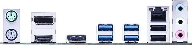 4 x USB 3.2 Gen 1 ports (4 x Type-A) 2 x USB 2.0 ports (2 x Type-A) 2 x DisplayPort 1 x HDMI port 1 x Intel I219V 1Gb Ethernet port 3 x Audio jacks 1 x PS/2 keyboard (purple) port 1 x PS/2 mouse (green) port