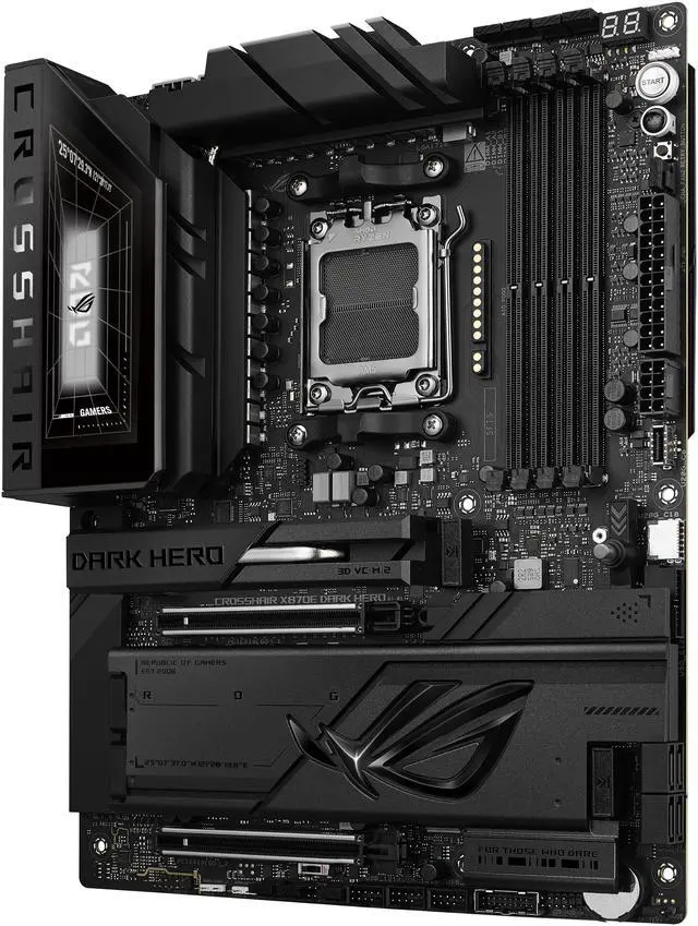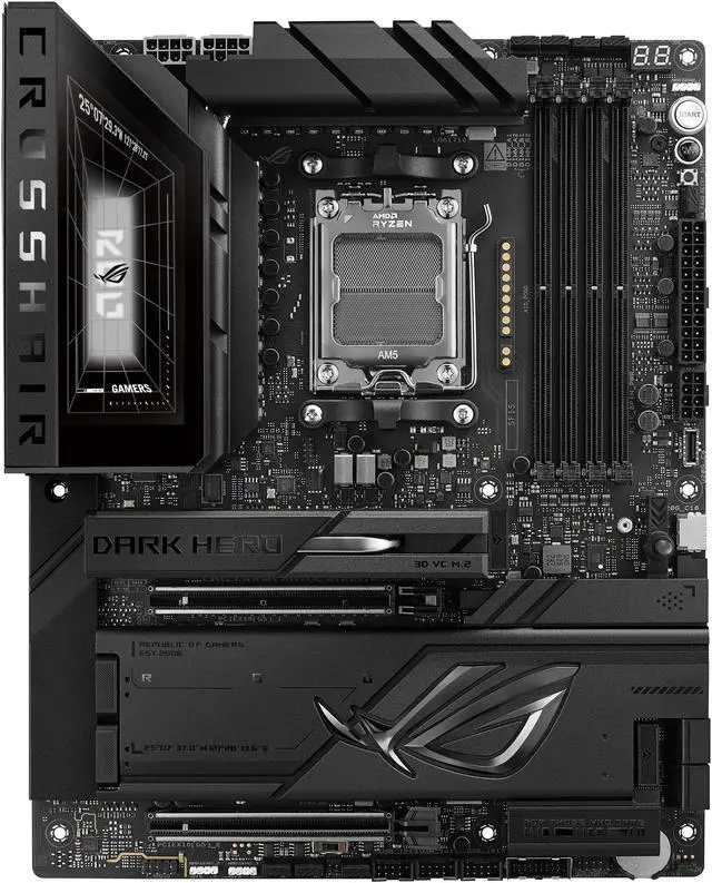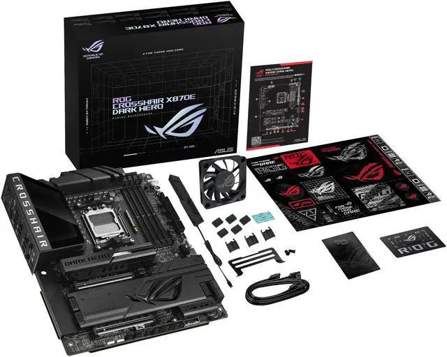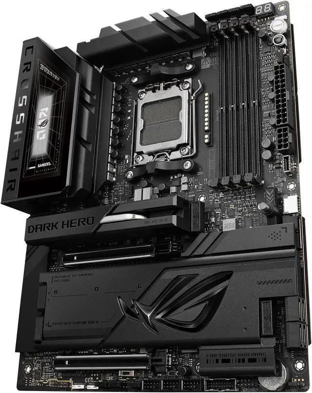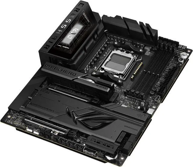 ASUS ROG Crosshair X870E Dark Hero ATX motherboard, 20+2+2 power stages, DDR5 slots, PCIe 5.0, five M.2 slots, 3D VC M.2 heatsink, USB4, AI Cache Boost, PCIe Slot Q-Release, AIO Q-Connector