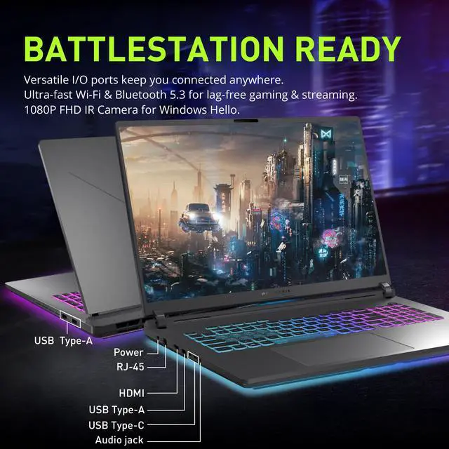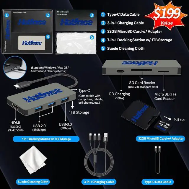 Windows 11 Pro: 14.35" x 10.55" x 0.85", 5.3 lbs. Ports: 2x USB-C, 3x USB-A, 1x HDMI, 1x Audio combo jack, 1x RJ45. Wi-Fi 7 + Bluetooth 5.4. Bonus Docking Station Set: 1x 7-in-1 Docking Station w/ 1TB Storage, 1x 32GB MicroSD Card w/ Adapter, 1x Type-C Data Cable, 1x 3-in-1 Charging Cable, 1x Suede Cleaning Cloth.