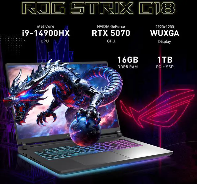 ASUS ROG Strix G18 18" Gaming Laptop packs an Intel Core i9-14900HX and NVIDIA GeForce RTX 5070 for elite gaming performance. Features a fast 144Hz display, RGB backlit keyboard, and numeric keypad.