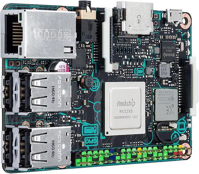 MAIN OVERVIEW FEATURES: Processor Manufacturer: RockchipProcessor Type: Cortex A17Processor Model: RK3288Processor Core: Quad-core (4 Core)Processor Speed: 1.80 GHzStandard Memory: 2 GBMemory Technology: LPDDR3Graphics Controller Manufacturer: ARMGraphics Controller Model: Mali-T764Wireless LAN: YesWireless LAN Standard: IEEE 802.11b/g/nBluetooth: YesBluetooth Standard: Bluetooth 4.0 + EDRHDMI: YesTotal Number of USB Ports: 4Number of USB 2.0 Ports: 4Network (RJ-45): YesOperating System: TinkerOSForm Factor: Ultra SmallWeight (Approximate): 1.94 ozPackage Contents: Tinker Board Single Board Computer Passive heatsink User manual Environmentally Friendly: YesEnvironmental Certification: RoHS,WEEE,Taiwan RoHSCountry of Origin: Taiwan