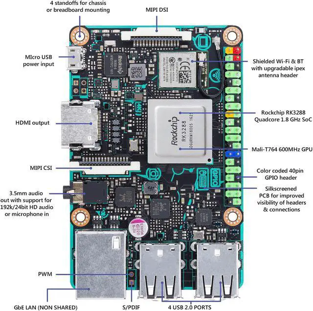 • DIY Friendly Design - Tinkerboard features multiple DIY friendly use features including a color coded GPIO header, silk-screen PCB and color-coded pull tabs