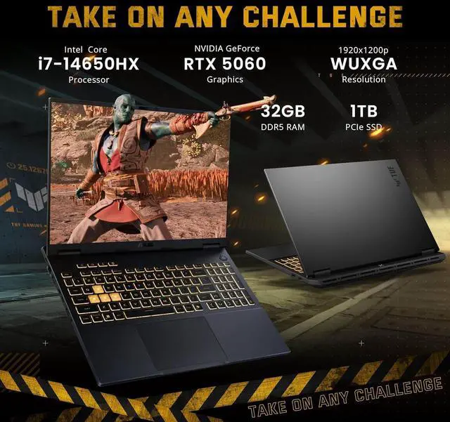 The ASUS TUF F16 16" FHD+ 165Hz Gaming Laptop delivers powerful gaming performance with an Intel Core i7-14650HX processor and NVIDIA GeForce RTX 5060 8GB GDDR7 graphics, featuring a responsive RGB backlit keyboard for immersive control.