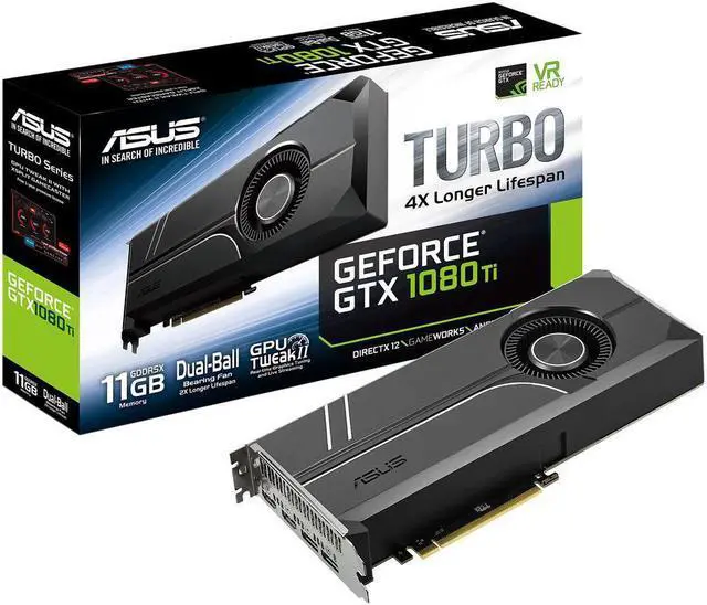 Powered by NVIDIA Pascal, the ASUS GeForce GTX 1080TI Turbo Edition features the world's fastest gaming GPU, delivering jaw-dropping 5K HD gaming experiences with 11GB GDDR5X memory and 1582 MHz boost clock. Take your system's performance to the next level with GPU Tweak II for precise control and monitoring.