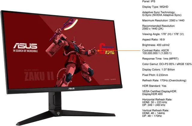 EXTREME DETAIL AND ACCURATE COLOR ASUS TUF Gaming VG27AQGL1A ZAKU II EDITION features a 27-inch, WQHD (2560 x 1440) IPS panel that delivers an astounding 1000:1 contrast ratio and superior imagery, with outstanding color across 130% of the sRGB gamut and DisplayHDR 400 certification.