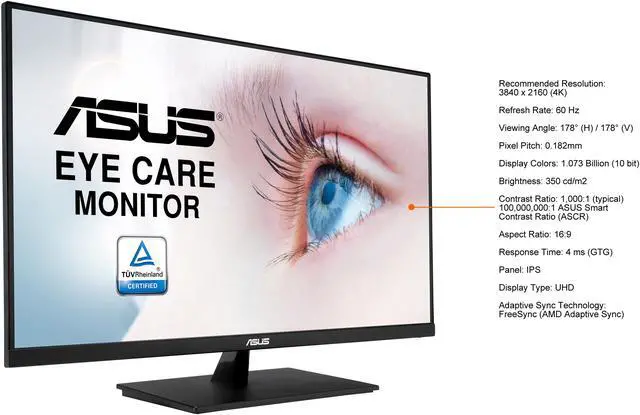 ASUS VP32UQ Eye Care monitor features 31.5-inch 4K UHD (3840 x 2160) with IPS 178° wide-viewing-angle, it delivers sharp, detail and immersive viewing experience. 100% sRGB provides realistic colors and smoother gradation. To achieves seamlessly smooth gameplay, VP32UQ with Adaptive-Sync technology to eliminate screen tearing and enhances image details in dark areas. In addition, ASUS Eye Care technology ensures a comfortable viewing experience.