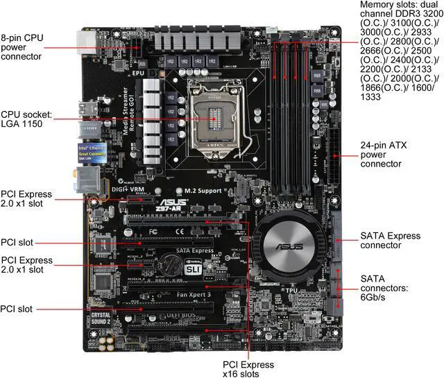 | Features | Multi-GPU Support: Supports NVIDIA Quad-GPU SLI Technology Supports AMD Quad-GPU CrossFireX Technology Special Features 5-Way Optimization by Dual Intelligent Processors 5 - Whole system optimization with a single click! 5-Way Optimization tuning key perfectly consolidates TPU, EPU, DIGI+ Power Control, Fan Xpert 3, and Turbo App together, providing better CPU performance, efficient power saving, precise digital power control, whole system cooling and even tailor your own app usages. ASUS 5X Protection: - ASUS DIGI+ VRM - 8 Phase digital power design - ASUS Enhanced DRAM Overcurrent Protection - Short circuit damage prevention - ASUS ESD Guards - Enhanced ESD protection - ASUS High-Quality 5K-Hour Solid Capacitors - 2.5x long lifespan with excellent durability - ASUS Stainless Steel Back I/O - 3x more durable corrosion-resistant coating ASUS TPU: - Auto Tuning - GPU Boost - TPU switch ASUS EPU: - EPU - EPU switch ASUS Digital Power Design: - Industry leading Digital 8 Phase Power Design - CPU Power Utility ASUS Exclusive Features: - Remote GO! - AI Suite 3 - Anti-Surge - ASUS UEFI BIOS EZ Mode featuring friendly graphics user interface - USB 3.0 Boost - Disk Unlocker - Turbo LAN - Crystal Sound 2 ASUS Quiet Thermal Solution: - Stylish Fanless Design Heat-sink solution ASUS EZ DIY: - Precision Tweaker 2 - ASUS O.C. Tuner - ASUS CrashFree BIOS 3 - ASUS EZ Flash 2 - ASUS UEFI BIOS EZ Mode - Push Notice ASUS Q-Design: - ASUS Q-LED (CPU, DRAM, VGA, Boot Device LED) - ASUS Q-Slot - ASUS Q-DIMM - ASUS Q-Connector Special Memory O.C. Design Overclocking Protection: - ASUS C.P.R. Media Streamer Turbo App Fan Xpert 3 BIOS: 64MB Flash ROM, UEFI AMI BIOS, PnP, DMI2.7, WfM2.0, SM BIOS 2.8, ACPI 5.0, Multi-language BIOS, ASUS EZ Flash 2, CrashFree BIOS 3, F11 EZ Tuning Wizard, F6 Qfan Control, F3 My Favorites, Quick Note, Last Modified log, F12 PrintScreen, F3 Shortcut functions, and ASUS DRAM SPD memory information |