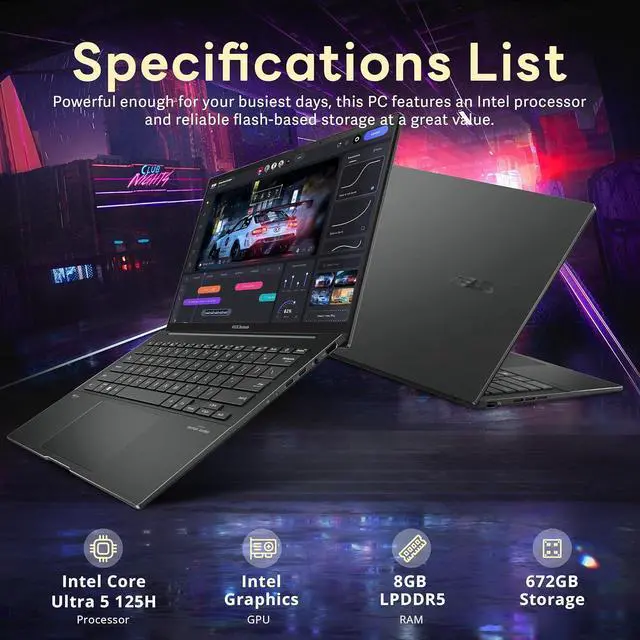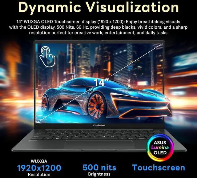 14" WUXGA OLED Display 14.0 -inch, WUXGA (1920 x 1200) OLED 16:10 aspect ratio, 0.2 ms response time, 60Hz refresh rate, 500nits HDR peak brightness, 100% DCI-P3 color gamut, Glossy display. ^^Intel Core Ultra 5 Processor 125H ProcessorExperience a perfect balance of performance and efficiency with the Intel Core Ultra 5 Processor 125H (18MB Cache, up to 4.5 GHz, 14 cores, 18 Threads), delivering smooth multitasking. ^^Intel GraphicsDelivering efficient visual performance for everyday computing, multimedia, and casual gaming, with support for 4K displays, AI-enhanced features.