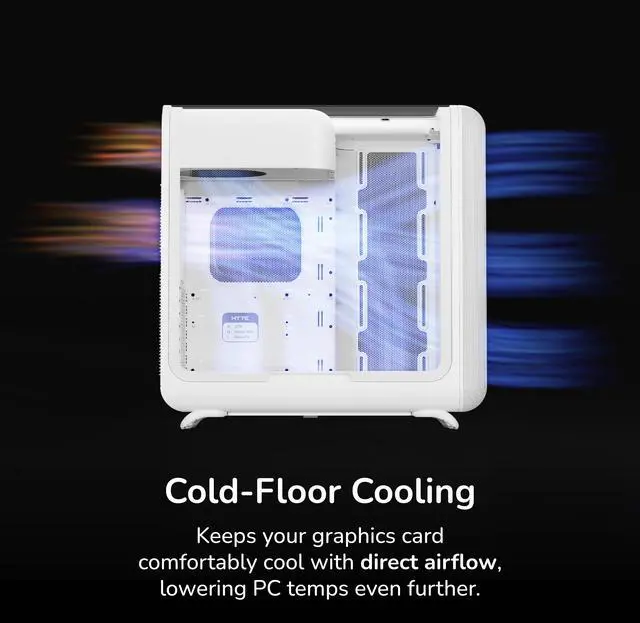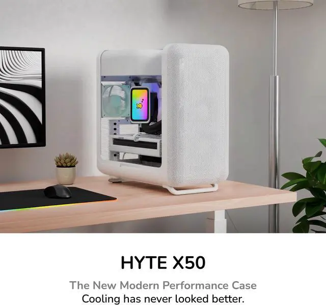 Achieve new modern performance in a HYTE X50 PC case, an industry changing computer chassis aimed at better airflow and lower temperatures while still maintaining a trendy aesthetic.Revolutionary cooling and airflow features are finally introduced thanks to the HYTE X50 case, creating a low pressure and low resistance air intake, thus increasing airflow. New louvered blade ventilation technology (patent pending) even slices through hot air using angled metal instead of punchouts. Finally, your gaming PC and the graphics card stays cooler than ever now that the power supply shroud is placed at the top, ensuring up to 360mm of fresh intake air hits straight to the GPU.