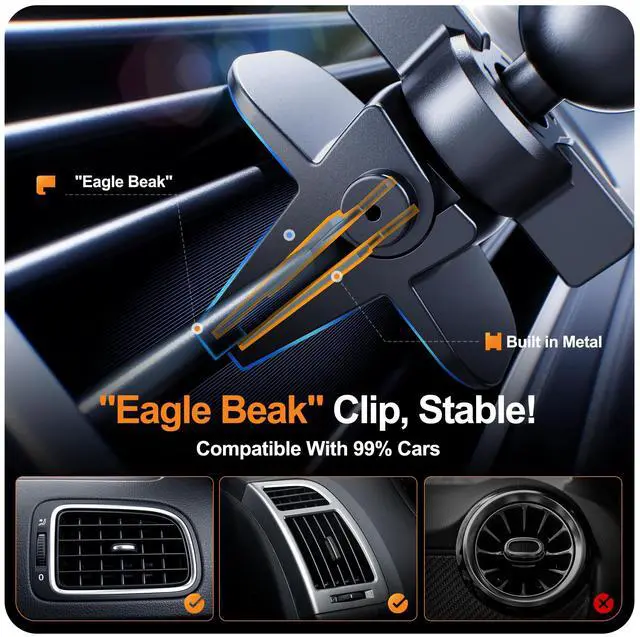 | Compatible Devices | "Eagle Beak" Clip: Secure and slip-resistant, fits 99% of cars (see image 6). |