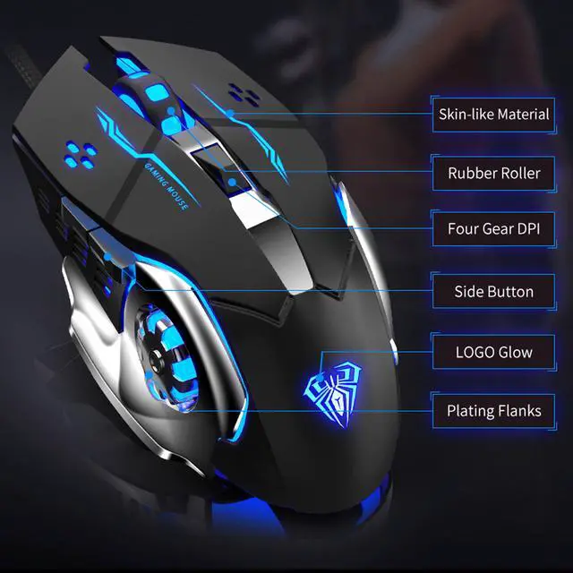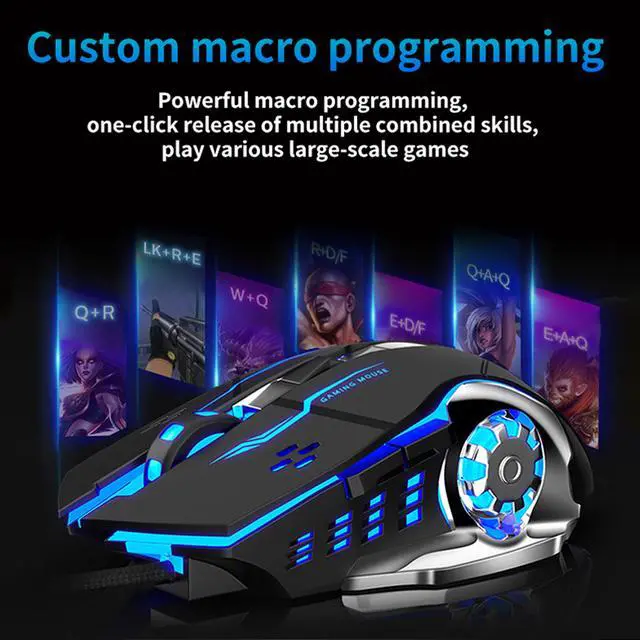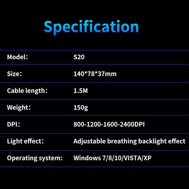 S20 wired gaming mouse, wired optical mouse with 6 keys, supports 4-color cyclic breathing. Powerful macro programming, one-click release of multiple combined skills. Fast and sensitive switching, 800-1200-1600-2400DPI one-key adjustment. Compatible with a variety of usb ports, no need to install drivers, plug and play.