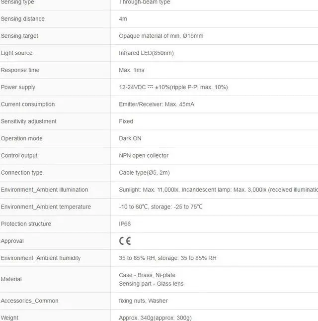 Sensing type : Through-beam type Sensing distance : 4m Sensing target : Opaque material of min. Ø15mm Light source : Infrared LED(850nm) Response time : Max. 1ms