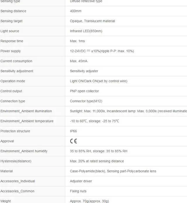 Sensing type : Diffuse reflective type