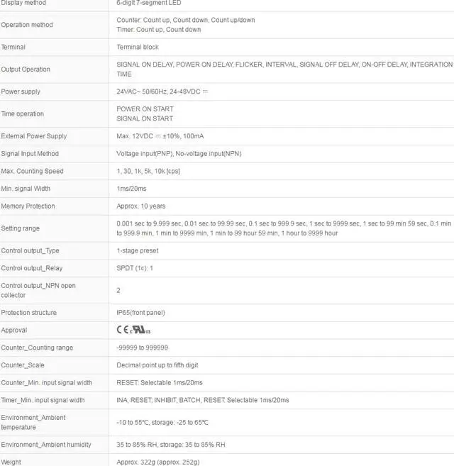 Output Operation : SIGNAL ON DELAY, POWER ON DELAY, FLICKER, INTERVAL, SIGNAL OFF DELAY, ON-OFF DELAY, INTEGRATION TIME