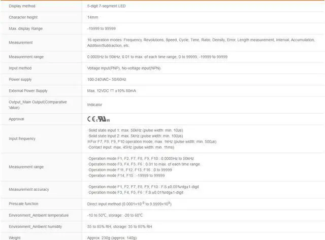 Measurement : 16 operation modes: Frequency, Revolutions, Speed, Cycle, Time, Ratio, Density, Error, Length measurement, Interval, Accumulation, Addition/Subtraction, etc.