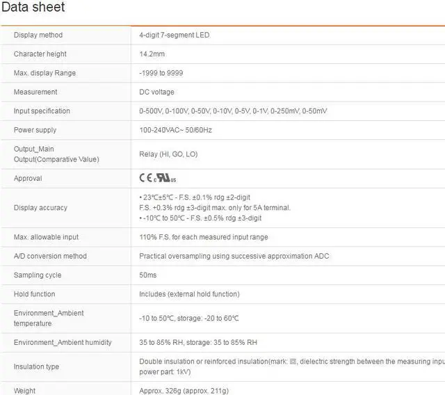 Input specification : 0-500V, 0-100V, 0-50V, 0-10V, 0-5V, 0-1V, 0-250mV, 0-50mV