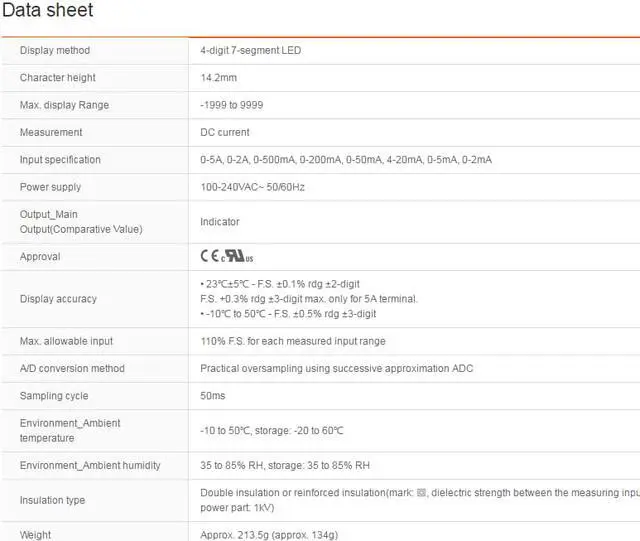 Input specification : 0-5A, 0-2A, 0-500mA, 0-200mA, 0-50mA, 4-20mA, 0-5mA, 0-2mA