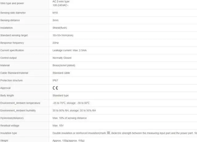 Autonics PR18-5AC Proximity Sensors Inductive NPN New 1PCS Wire type and power : AC 2-wire type 100-240VAC~ Sensing side diameter : M18 Sensing distance : 5mm Installation : Shield(flush) Standard sensing target : 18×18×1mm(iron