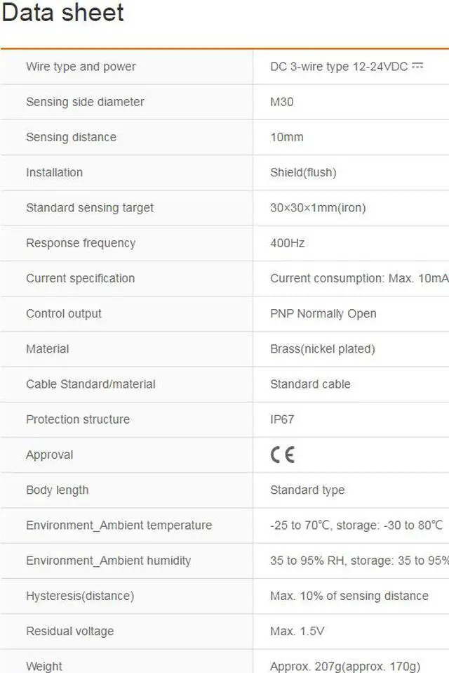 Wire type and power : DC 3-wire type 12-24VDC Sensing side diameter : M30 Sensing distance : 10mm Installation : Shield(flush) Standard sensing target : 30×30×1mm(iron)