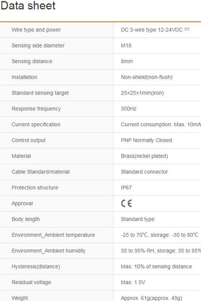 Wire type and power : DC 3-wire type 12-24VDC Sensing side diameter : M18 Sensing distance : 8mm Installation : Non-shield(non-flush) Standard sensing target : 25×25×1mm(iron)