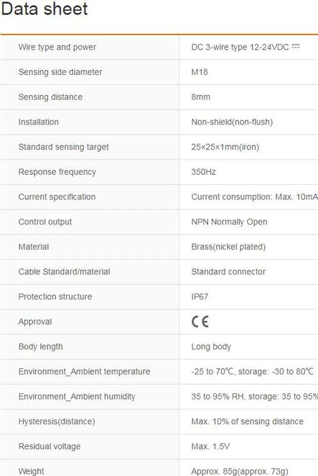 Autonics PRCML18-8DN Proximity Sensors Inductive NPN New 1PCS Wire type and power : DC 3-wire type 12-24VDC Sensing side diameter : M18 Sensing distance : 8mm Installation : Non-shield(non-flush) Standard sensing target : 25×25×1mm(iron)
