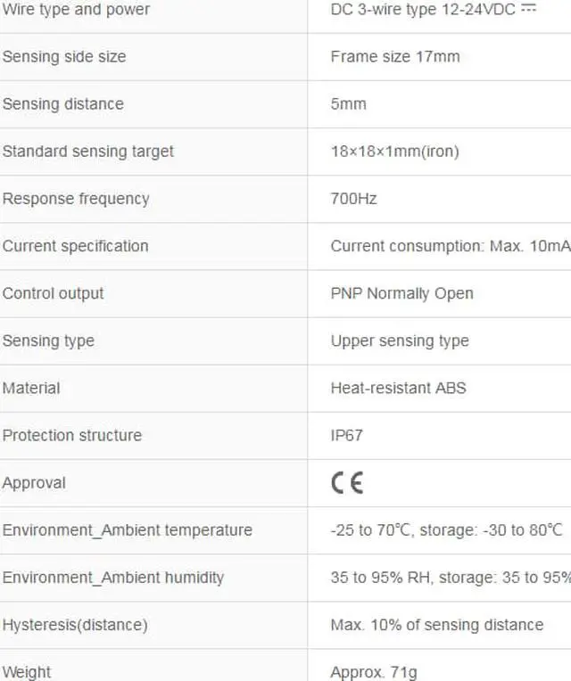 Autonics PSN17-5DPU Proximity Sensors Inductive PNP New 1PCS Wire type and power : DC 3-wire type 12-24VDC Sensing side size : Frame size 17mm Sensing distance : 5mm Standard sensing target : 18×18×1mm(iron) Response frequency : 700Hz
