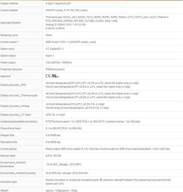 Input specification : Thermocouple: K(CA), J(IC), E(CR), T(CC), B(PR), R(PR), S(PR), N(NN), C(TT), G(TT), L(IC), U(CC), Platinel II