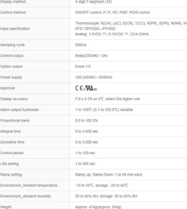 Control method : ON/OFF control, P, PI, PD, PIDF, PIDS control