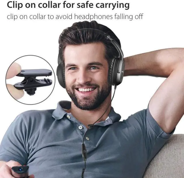 - Up to 16.4ft / 5m cable length. Additional collar clip engineered to create a safe and secure listening experience without falling out.
