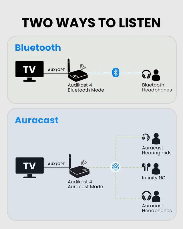 Classic Bluetooth only supports one device; Auracast allows multi-listening but requires compatible headphones or hearing aids.