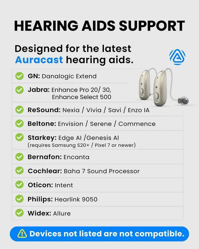 It works only with the Auracast-compatible hearing aid models shown in our product images – such as GN Danalogic Extend, Jabra Enhance Pro 20, and ReSound Nexia.