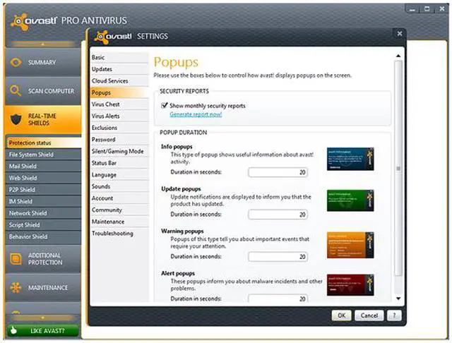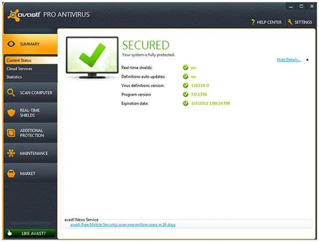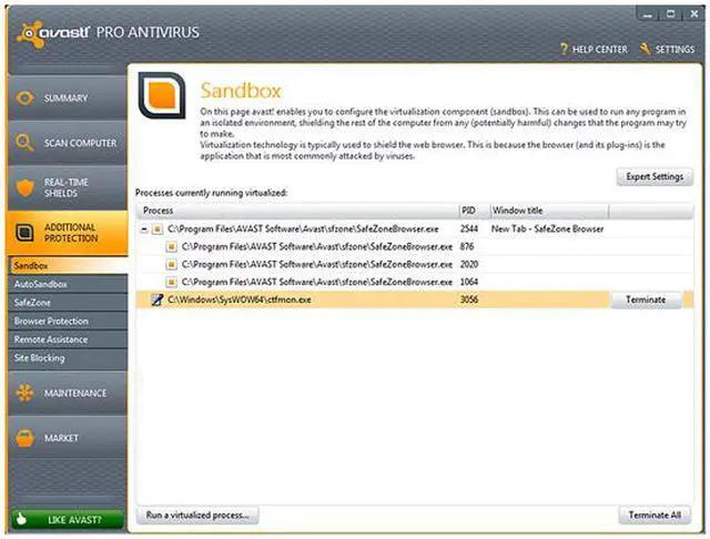 | Feature | STREAMING, REAL-TIME VIRUS DATABASE UPDATES Now you get each virus signature sent to you in real-time via a connection to the AVAST Virus Lab cloud, rather than needing to wait for a traditional database update. FILE REPUTATION SYSTEM FileRep lets you know whether a file is safe before you open it - determined in part by how many people have the file and how new the file is. AUTOSANDBOX Suspicious programs are now automatically placed inside the avast! Sandbox. When the program finishes, a comprehensive report is generated and, based on the program's behavior, you are given a recommendation on how to treat it in the future. BROWSER SANDBOXING Enabled by a single click of the mouse, it allows you to completely isolate the browser from the rest of the system - even if the browser gets hijacked, your system stays clean. WEBREP The version 7 WebRep browser plugins provide greater protection against phishing sites, including heuristics detection of new phishing sites. SAFEZONE Available only in Pro Antivirus and Internet Security, our SafeZone, your ultimate clean and secure window for financial transactions, now auto-prompts you move to the SafeZone from your regular browser. AVAST MANAGEMENT PORTAL Your web-based AVAST Account portal is your personal directory for all your avast! related data. It allows you to track all your avast! installations, complete with their health data, status information, and useful statistics. REMOTE ASSISTANCE Our new Remote Assistance tool lets you initiate remote support from any 'geek' among your friends or family who agrees to help. Initiated by you, it routes through AVAST's servers, bypasses firewalls, and can be terminated by you at any time. CUSTOMIZABLE INSTALLATION Your avast! software can now be installed in Compatibility Mode, meaning that it will run perfectly along with your other antivirus software to act as a second line of defense. |