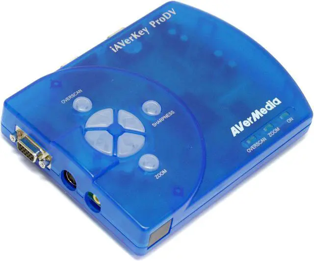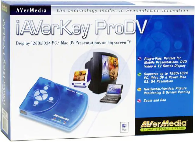 | Features | Plug & Play, no software drivers required Compatible with all PCs, iMac DV, Power Macintosh G3, G4 Touch-button control panel Supports resolutions up to 1280 x 1024 (PC & MAC) with 16.7 million colors Up to 3-level flicker-filter selection for sharpness control Simultaneous display on computer and TV monitors (Supports all VGA monitors and MAC monitors up to 1280 x 1024) Zoom & Pan Zoom sharpness control Underscan/Overscan (Underscan up to 1280x1024) Horizontal/vertical picture positioning Horizontal/vertical screen panning Supports Composite/S-Video/Scart RGB video output |