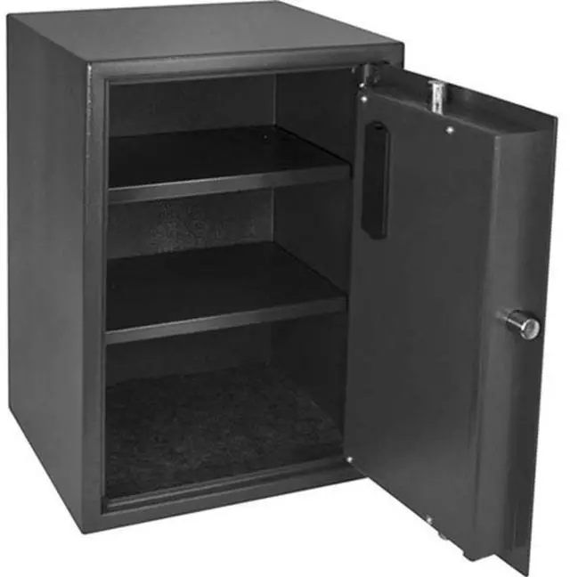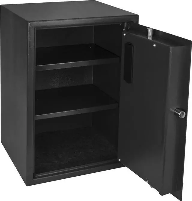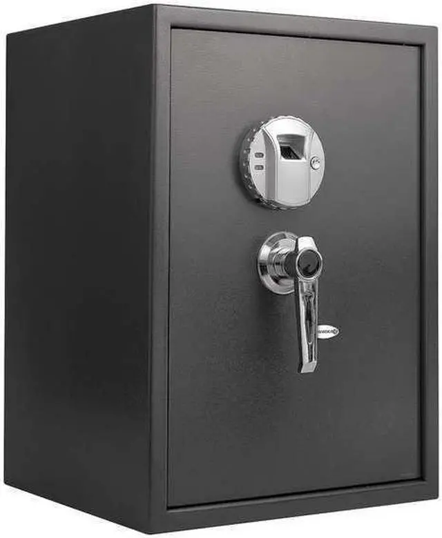 California Proposition 65: This product contains a chemical known to the State of California to cause birth defects or other reproductive harm. Floor Safe, Black, Net Weight 48.5 lb, Capacity 1.23 cu ft, Water Endurance Not Specified, Material Steel, Finish Matte Paint, Number of Shelves 2 Adjustable, Lock Style Biometric, Number of Bolts 2, Outside Height 19 3/4 in, Outside Width 14 in, Outside Depth 13 in, Inside Height 19 1/2 in, Inside Width 13 1/2 in, Inside Depth 9 1/2 in, Door Plate Thickness 3/16 in, Wall Thickness 1/16 in, Holds Documents, Records, Electronics, Small Firearms, Jewelry and Valuables. This item has been restricted from sale in the following state (s): []