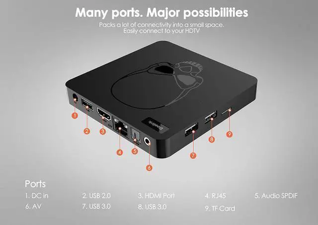 Interface:USB3.0*2, USB2.0*1, HDMI*1, RJ45*1(1000Mbps), AV(CVBS)*1Headphone microphone jack, TF Card*1Micro SD card Port, DC-in*1