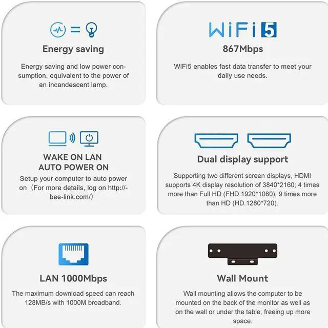 High-Speed NetworkThe mini desktop pc supports WIFI 5( 802.11 ac) for ultra-fast wireless connections, enabling smooth streaming and speedy downloads. The max download speed achievable is 128Mbps at 1000M broadband, so you can have a deticated and undisturbed channel when playing games. Built-in Bluetooth 4.2 allows for effortless pairing with various peripherals, such as wireless keyboards, mice, earphones, monitoring camera, printer, monitor, TV, projector etc.