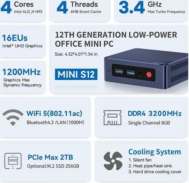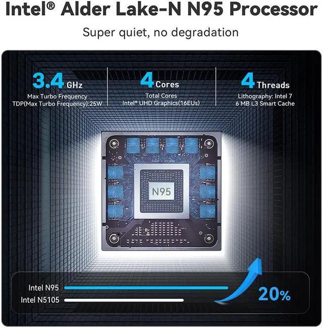 Intel 12th Alder Lake-N95Beelink Mini S12 Mini Pc comes with 12th Gen Intel Alder Lake-N95 Processor(4C/4T, 6M Cache, up to 3.4GH z) and Intel UHD Graphics, using 10nm lithography process, TDW 15W. The performance improved 25% compare to the N5105, N5095 and J4125. Perfect for handle streaming, photo editing, office work tasks or use as a NAS and soft router.