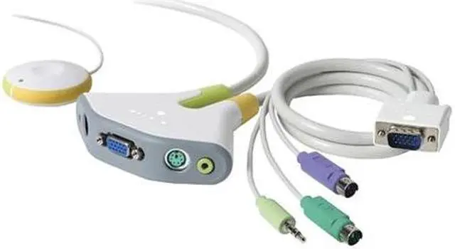 Flip two-port (keyboard, video, mouse) switch equipped with remote and PS/2 shares one monitor, keyboard, and mouse between computers. Shares one set of speakers between computers. Connects instantly to notebook computers. Supports PC and Mac notebook and desktop computers. Two-color LED indicates which computer flip switch is accessing. Install in three easy steps with no software required. Flip switch includes two built-in cables to connect computers and a remote base with cables.